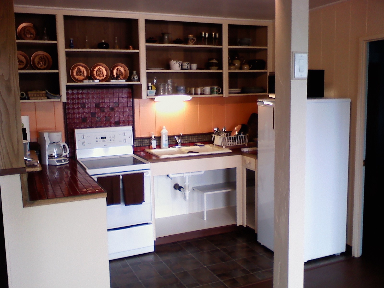 The kitchenette opens into the livingroom and enjoys the views of the bay.