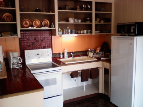 The full service kitchenette opens into the livingroom-dining area and shares the full view of the bay.