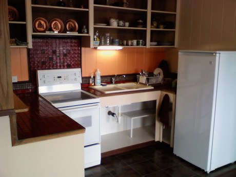 Kitchenette opens directly into living room space.